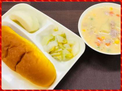 きょうのコーンクリームシチュー(米粉)は、小麦アレルギーのある児童生徒も食べることができるように、小麦粉を使った手作りルウの代わりに水どきの上新粉でとろみをつけています。