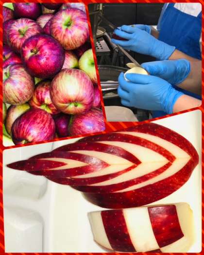 下の画像は調理員さんが飾り切りしたりんごです。給食を取りに来た当番さんはみんな口々に「すごーい」と言って喜んでいました。
