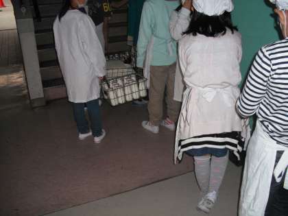 牛乳や食器・みそ汁などが入った食缶・ごはん・大きなおかず・小さなおかずなどを当番で手分けして、慎重に教室まで運びます。