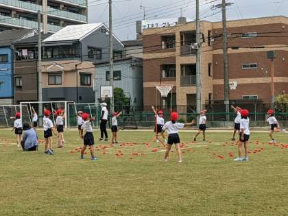 10月6日(水)、1年生の練習の様子です。パプリカの曲で踊り、曲が止まったら玉入れです。