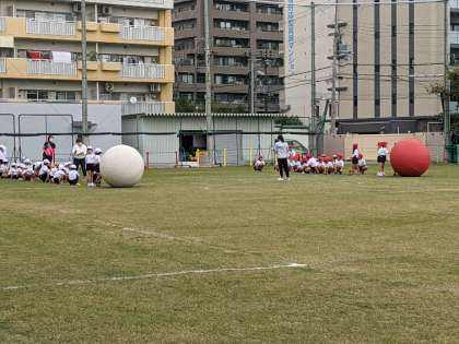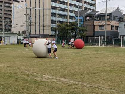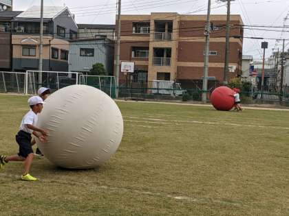 10月6日(水)、2年生の練習の様子です。大玉転がしです。体より大きな玉ですが上手に転がせるようになってきました。
