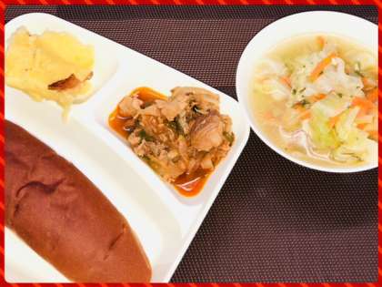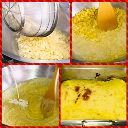 給食のスイートポテトは、さつまいもを煮くずれる程度に柔らかく煮、砂糖、バター、牛乳、クリームを加えてさらに煮、焼き物機で焼いています。また、卵アレルギーのある児童生徒も食べることができるよう、卵は使用していません。