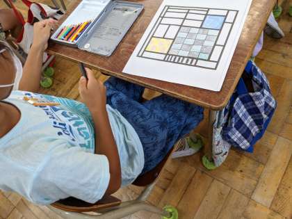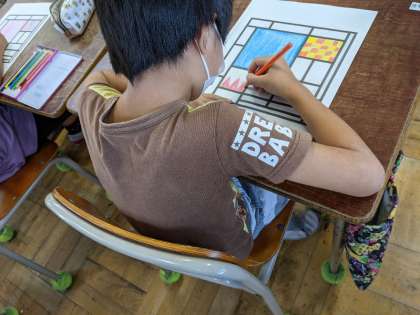 10月14日(木)、3年1組の図画工作科の様子です。「だれでも モンドリアン」という教材で自分なりの作品をつくりました。