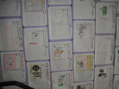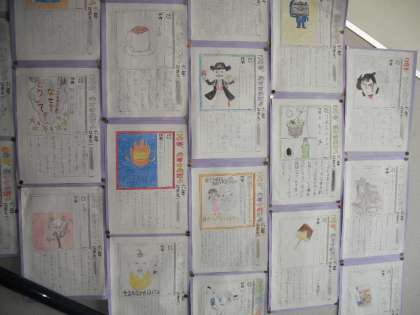階段の掲示板に、6年生が書いたおすすめの図書の本の紹介がありました。本の題名と作者名・内容に関係のあるイラストと読んだ感想やおすすめの理由が書かれていました。