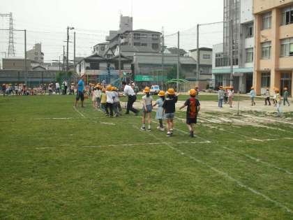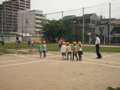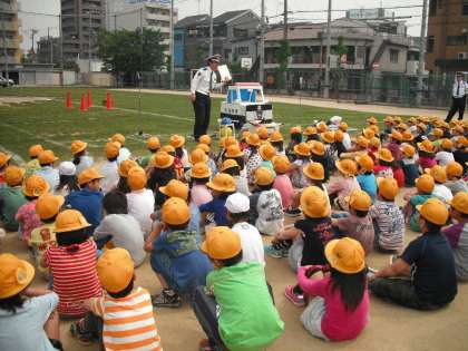 住之江警察から担当の方が来ていただき、楽しく交通安全の話をしていただきました。その後、運動場に道路の線を引き、信号機も置いて、安全な歩行の仕方を学習しました。楽しいおまわりさんの話に、子どもたちは歓声を上げながら聞いていました。