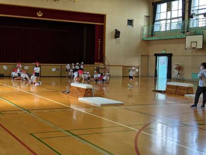 10月15日(金)、2年生は1組が運動場でボール運動、2組は体育館で跳び箱を学習していました。