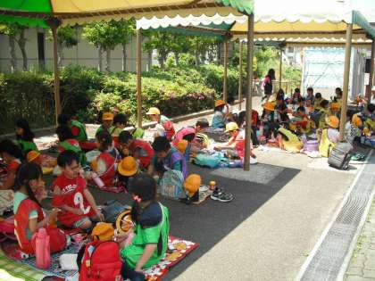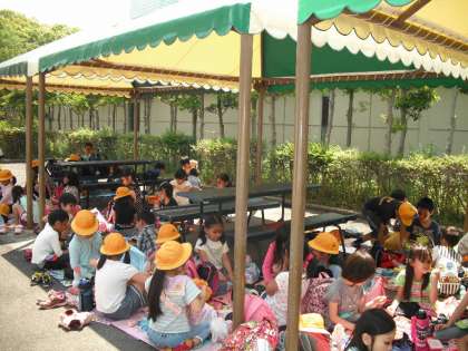 待ちに待ったお弁当は、テントの下を確保できましたので、涼しくゆっくりと食べることができました。子どもたちは、にぎやかにおいしさいっぱいの笑顔で食べていました。