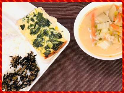 きょうの千草焼きには、具材として油漬けの鶏ささみ、とうふ、コーン、みつばを使用しました。