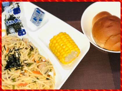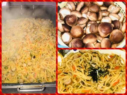 「ウインナーときのこの和風スパゲッティ」は、オリーブ油でにんにくを香りよくいため、ウインナー・ベーコンを主材に、季節の食材のしめじ・しいたけのほかに、たまねぎ、にんじん、ピーマンを使用し、しょうゆベースの和風の味つけで、これにきざみのりをかけて食べます。児童にも大好評でした
