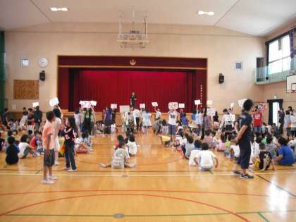 5月14日(木)児童集会で、ふれあいグループ(1年〜6年の各学年の子どもがいる縦割り班)の初めての集まりがありました。