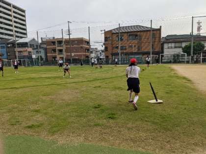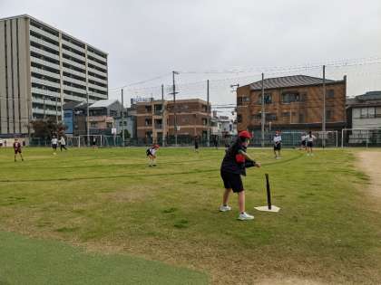 11月18日(木)、6年2組が体育科で野球をしていました。止まっているボールを上手に打っていました。