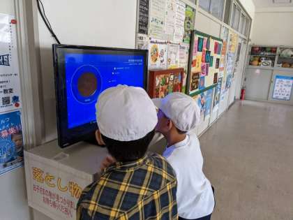職員室前で月食のことを紹介しています。子どもたちは興味をもってみています。