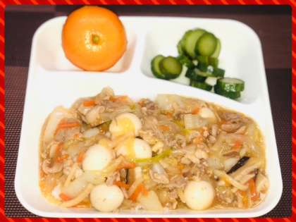 中華丼は、豚肉、うずら卵、はくさい、たまねぎ、たけのこ、にんじん、しょうが、しいたけを使用し、中華スープの素、砂糖、塩、こしょう、こい口しょうゆで味つけをし、でんぷんでとろみをつけています。野菜をたくさんとることが出来る大好評のメニューで、ほとんどの学級で完食でした。