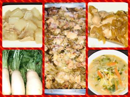 今回の給食では、田辺だいこんを使用します。田辺大根は、大阪市東住吉区田辺地区の特産であった白首大根(根の上部まで白色の大根のこと)です。根身は白色の円筒形で、末端が少し膨大し、丸みを帯びています。肉質は緻密で柔軟であり、甘味に富んでいます。
