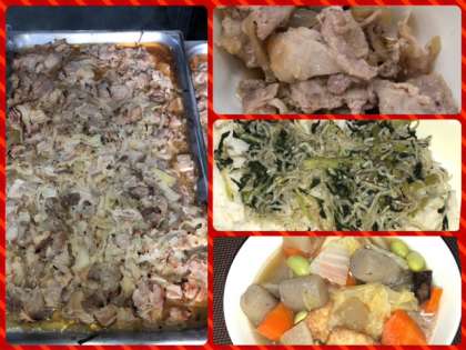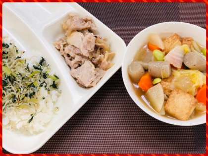 じゃこ菜っ葉ごはんは、ちりめんじゃことだいこん葉(乾)を使い、骨や歯を丈夫にするカルシウムが豊富です。スタミナ焼きは、にんにくと白みその味付けがよくあい、あったか煮は、でんぷんでとろみをつけ、冷めにくく、体が温まるように工夫されています。