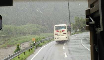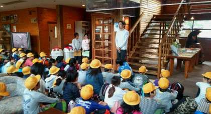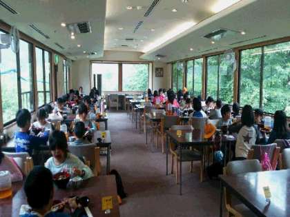 ハイキングも終え、疲れた体に焼き鳥どんぶりがうまそうです。きれいな空気の中で食べるご飯は格別なことでしょう。最後の閉舎式で河鹿荘の方のお話を伺いました。そして、一路 大阪をめざして出発しました。 バスは予定より少し早く、到着が4:10前後になりそうです。