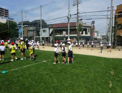 7月2日(木)、雨で延期になっていたふれあいスポーツ集会が行われました。代表委員会の子どもが司会・進行を務めました。全学年の縦割り班で、1・6年、2・5年、3・4年のペアを作り、王様ドッジボールや長縄跳び・チェンジ鬼ごっこをしました。ペアで手をつないでの活動や班対抗の活動などで、子どものつながりがより緊密になり、笑顔の絶えない45分間でした。