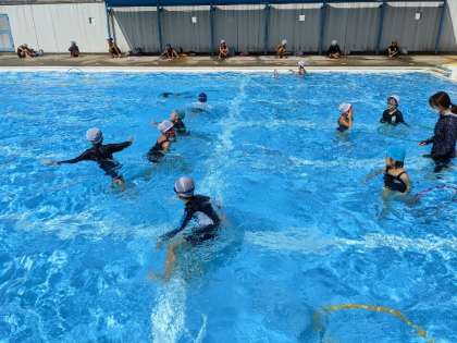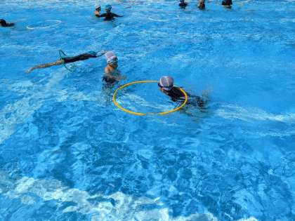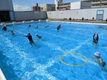 8月31日(水)、2年生が水泳学習を行いました。輪投げを使って水慣れをしました。