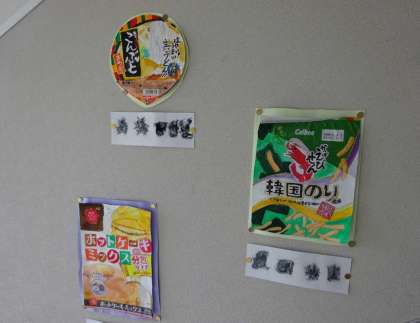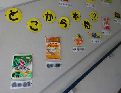 6年生の図工の作品が階段掲示板に貼り出されています。「どこから本物」というタイトルで、商品の一部をそのまま使い、残り部分を子どもたちが本物そっくりに描きあげました。そばまで近寄ってみないと、どこに本物が残っているのか見分けがつかないほどの力作ぞろいです。