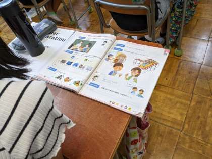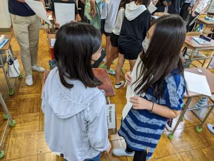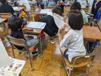 9月20日(火)、6年2組外国語の様子です。夏休みの出来事の感想を英語でたずねあっていました。