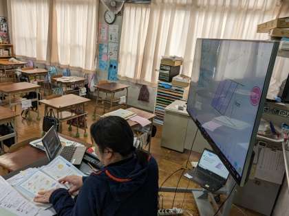 2月16日(木)、オンライン学習をしている様子です。清江小学校では、どの先生も児童に寄り添い、場にあった教育を提供しています。