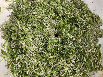 ピーマンは、おもに体の調子を整えるもとになる緑のグループの食べ物です。のどや鼻をじょうぶにする「カロテン」やかぜを防ぐ「ビタミンC」を多く含む野菜です。今日の給食では、ゆでたちりめんじゃことピーマンをいためて砂糖、料理酒、こいくちしょうゆで味付けをしました。