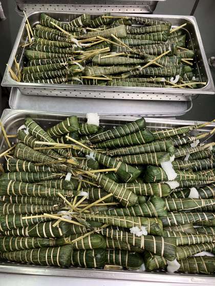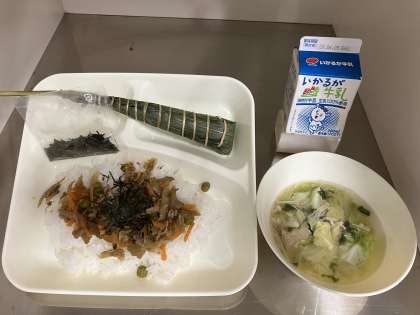 今日は『こどもの日の行事献立』です。児童に人気の「ちまき」がでました。ちまきは、もち米や米の粉などで作ったもちを笹の葉でくるみ、蒸して作る和菓子です。こどもが元気に育ちますようにという願いがこめられています。