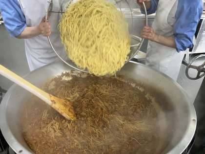 今日のミートソーススパゲティには、手作りのブラウンルウが入っています。牛ひき肉と豚ひき肉、たまねぎ、にんじん、ピーマン、マッシュルームなどが入っておりケチャップやトマトピューレ、ウスターソース、ブラウンルウ、塩、こしょう、ローレルで味付けしています。たくさんの「おいしかったよ!」の声が聞こえました。