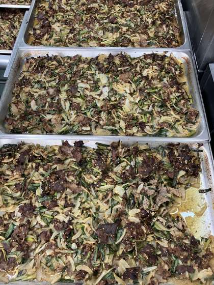 プルコギは、韓国・朝鮮の料理です。牛肉にしょうが汁、すりおろしにんにく、コチジャン、すりごま、砂糖、こいくちしょうゆなどで下味をつけ、たまねぎとにらを混ぜ合わせて焼き物機で焼きました。