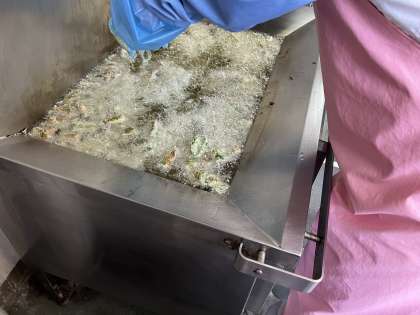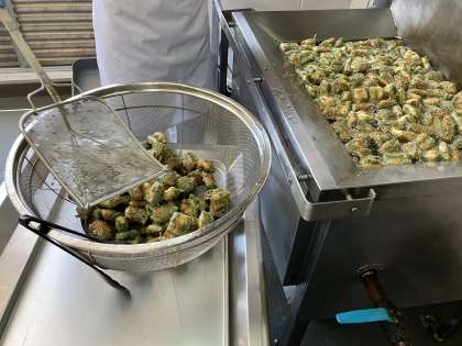 ちくわは、少量の水、小麦粉、あおのりで衣をつくり、ちくわにつけてフライヤーであげています。