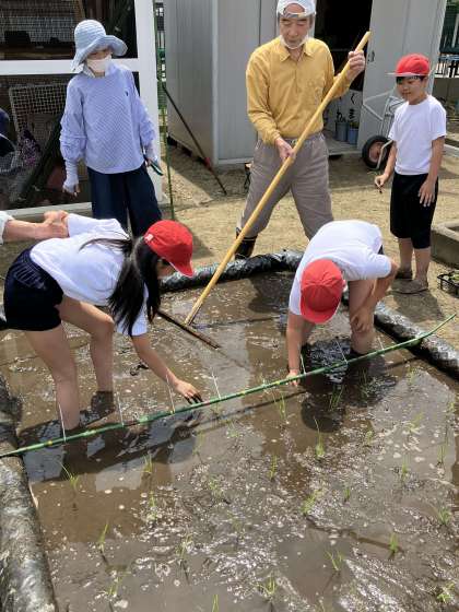裸足で学習園の田んぼに入った5年生は「気持ちいい〜。」「足が抜けない!」と口々に感想を伝えながら、楽しく田植えを行いました。