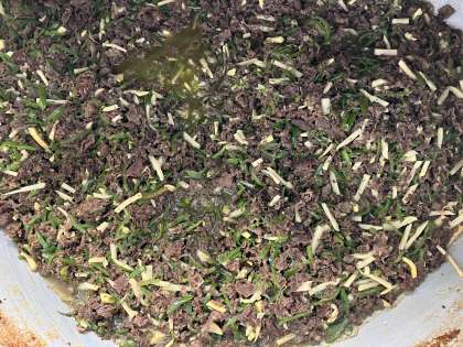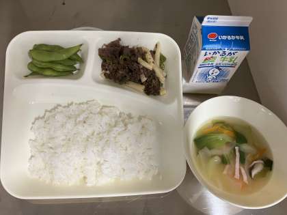 チンジャオニューロウスーは、ピーマンと牛肉を細く切っていためた中国の料理です。今日の給食では、牛肉としょうが、ピーマン、たけのこをいためて砂糖、こいくちしょうゆ、オイスターソースで味付けしました。