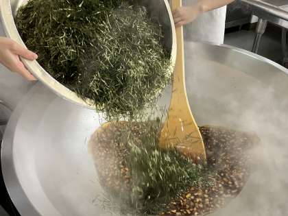 つくだ煮とは、魚や海そうなどをしょうゆやさとう、みりんなどの調味料で煮詰めたものです。今日の給食では、さとうやみりん、しょうゆなどの調味料とだしを合わせ、しいたけときざみのりをいれて煮つめて作りました。ごはんが進む一品です。