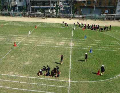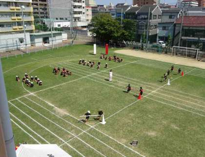 9月29日(火)秋晴れの中、4年生は団体演技の「エイサー」の後、団体競技と個人走の練習をしていました。団体競技は「台風の目」です。4年のお子さんは、台風の目ではどのチームの何番目、個人走では何番目の何コースでしょう。スタート・ゴールの位置も含め、当日の参考にしてください。