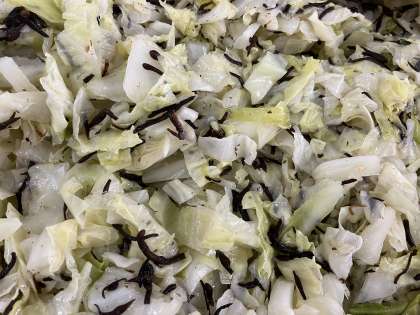 ボイルしたキャベツに、ひじき、砂糖、塩、米酢、うすくちしょうゆ、綿実油をあわせて煮たタレをかけていただきました。