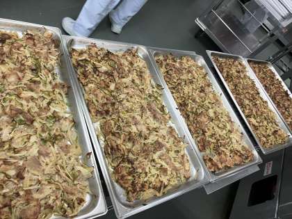 金時豆は、いんげん豆の仲間です。色はこい赤むらさき色をしています。たんぱく質のほか、炭水化物、おなかの調子を整える食物せんいなどを多く含んでいます。また、ビタミンB1やビタミンB2,貧血をふせぐ鉄なども含まれています。今日は大きな釜で煮ています。ふっくらと甘く美味しい煮ものができました。
