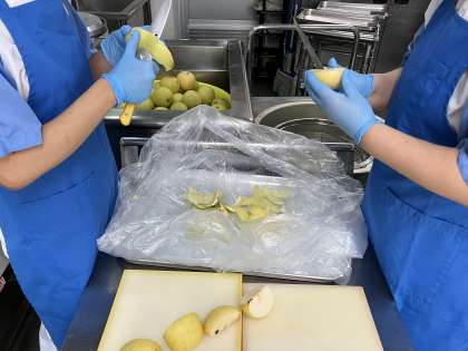 日本なしの主な産地は、千葉県、茨城県、栃木県、福島県、長野県などです。今日の給食には、鳥取県産の「二十世紀なし」が登場しました。一つ一つ検品後、調理員さんが1/4に切って皮と芯をとってくれました。