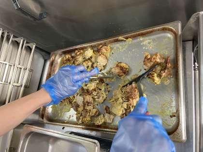豚肉とたまねぎをワイン、塩こしょう、カレー粉、綿実油をあわせて焼き物機で焼きました。配缶前に調理員さんが食べやすいようにほぐしてくれています。
