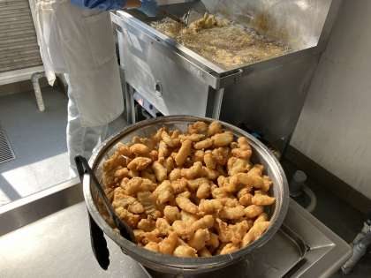 フリッターとは、小麦粉や泡立てた卵白などで作った衣をつけて油であげたものです。ふっくらとした衣が特ちょうです。給食のフリッターは、衣に卵を使っていないので、卵アレルギーのある人も食べることができます。今日の給食の『白身魚のフリッター』は、「たら」を使っています。