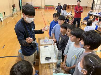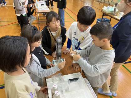 出前授業では、実際に淀川の水を飲める状態にまできれいにする実験をさせていただきました。水が飲める状態にまできれいになっていく様子に、興味津々でした。