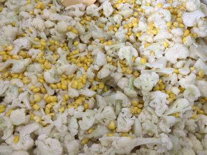 カリフラワーが一番美味しい旬の時期は、11月から3月頃です。この時期のカリフラワーは、つぼみの部分が大きく、味もよくなります。今日の給食では、コーンと一緒にピクルスにしています。