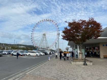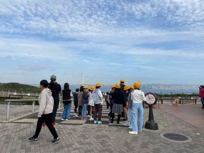 淡路SAに着きました。トイレ休憩と記念写真撮影をしました。全員元気で、明石海峡大橋の美しい景色を見ながら楽しんでいます。