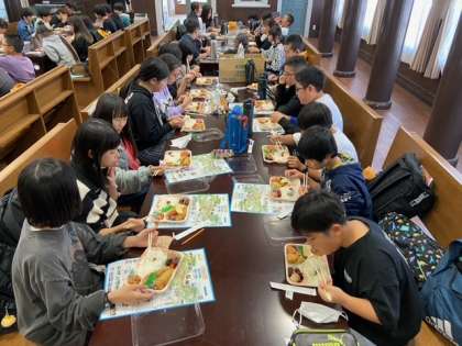 イングランドの丘に着きました。きれいな建物内の部屋でお昼ごはんを食べました。みんなで美味しくいただきました。