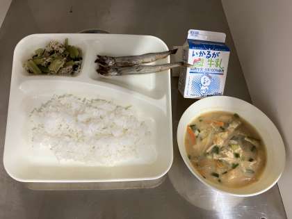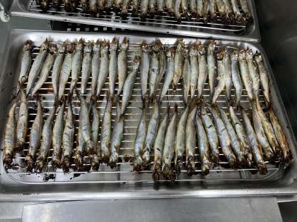 ししゃもは、北海道の太平洋岸にすむキュウリウオ科の魚です。川で生れ、海で1年半くらいかけて成長した後、10月〜11月頃には、再び川をさかのぼって卵を産みます。給食に使われているししゃもは、カラフトシシャモ(カペリン)と呼ばれる魚です。今日は、ししゃもに料理酒、みりん、綿実油で下味をつけて焼き物機で焼きました。
