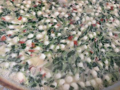 *ぞう煮…もちといろいろな具材を入れた汁ものです。地方や家庭によって入れる具や味付けなどに特色があります。給食では、かつおぶしでだしをとり、白玉だんごや鶏肉、だいこん、きんときにんじん、さといも、みつばを使用し白みそで味付けしています。