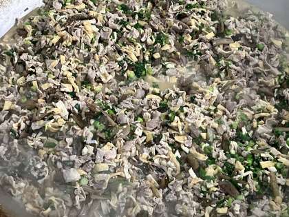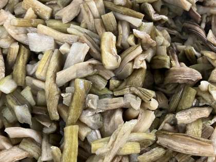 ずいきとは、さといもの葉と茎をつないでいる部分を呼びます。干しずいきは、ずいきの皮をむいて、水にさらした後、乾そうさせたものです。食物せんいやカルシウム、鉄を多く含んでいます。今日の給食では、干しずいきをみそで味付けした煮物で登場しました。