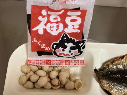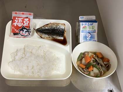 *今日の給食では、節分の行事献立として【いわしのしょうがじょうゆかけ】と【いり大豆】がでました。