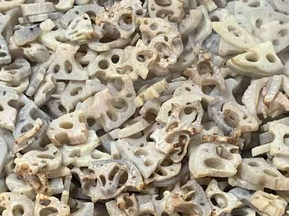 れんこんは、浅い沼地などで栽培されています。私たちが食べているれんこんは、地中にある茎の部分です。れんこんの穴は、呼吸するための空気を送り込む役割をしています。またれんこんには、ビタミンCや食物せんいを多く含んでいます。