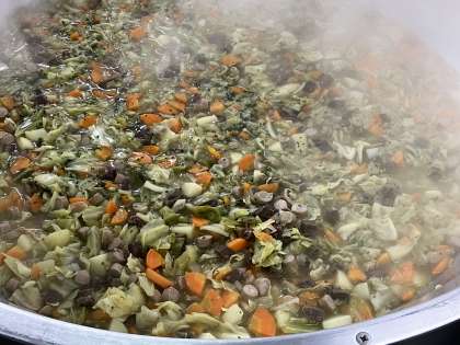 ポトフとは、肉や野菜、香草などを煮こんだフランスの家庭料理の一つです。煮こんだ肉、野菜をスープと一緒に食べます。給食では牛肉やウインナー、じゃがいも、キャベツ、にんじん、パセリを使っています。