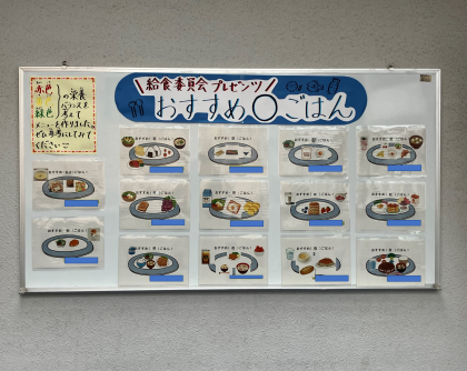 給食委員会では、主にエネルギーのもとになる黄色の食べ物、体を作るもとになる赤色の食べ物、体の調子を整える緑色の食べ物がバランスよくはいった献立を考えました。